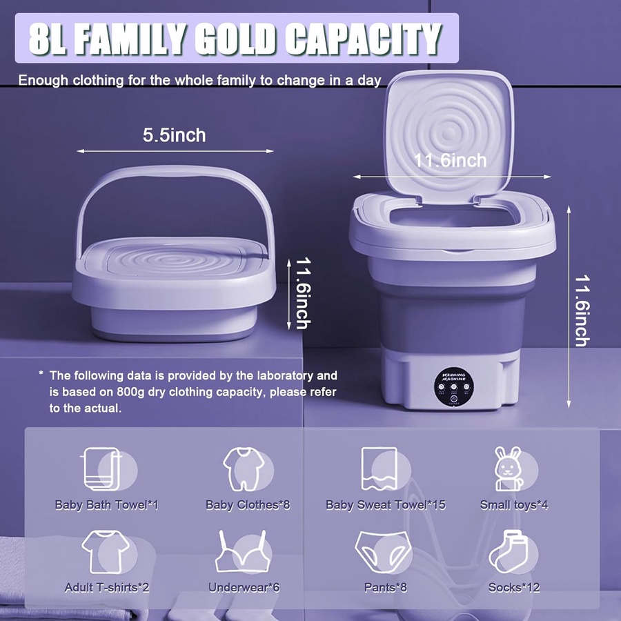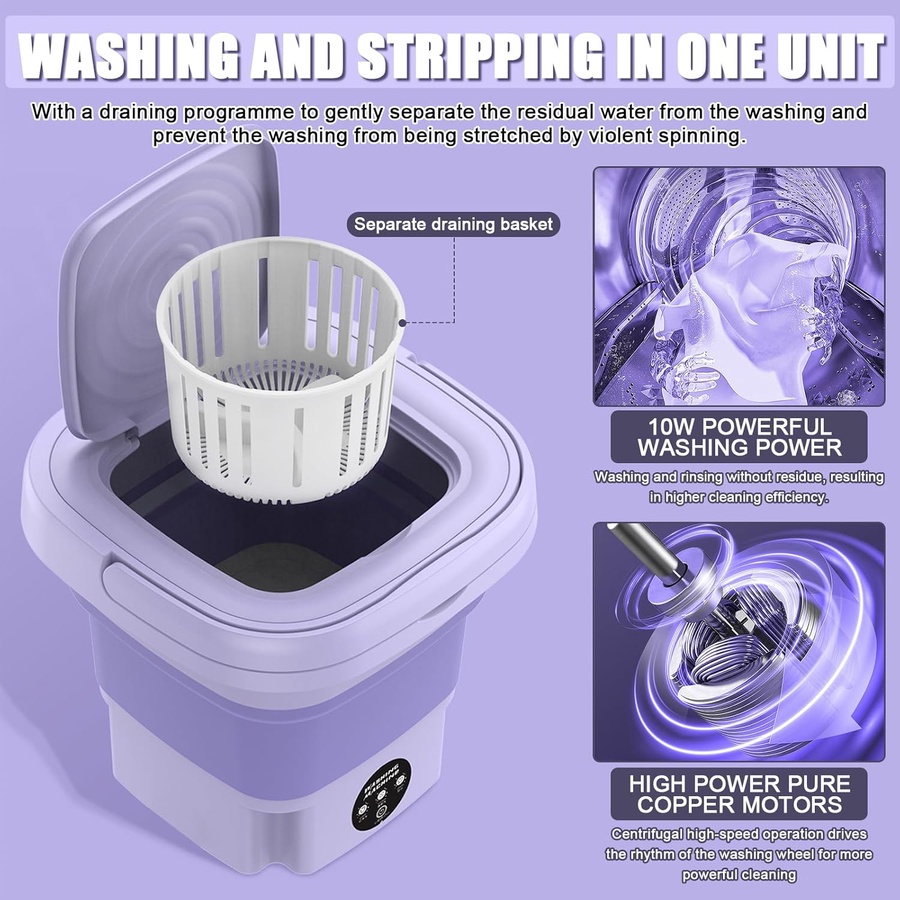 حجم صغير وسعة عملية لغسل الملابس الخفيفة في أي مكان: سفر، تخييم، سكن طلابي، أو للملابس الداخلية والأطفال. تشغيل هادئ مع خاصية التعقيم ومقبس أوروبي.